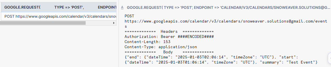 USE ROLE LEARN_DEV_DEVELOPER; USE SCHEMA SNOWEAVER.GOOGLE; -- Preview the content of the request SELECT request( type => 'post', endpoint => 'calendar/v3/calendars/[Your Google Account]@gmail.com/events', headers => { 'Authorization': 'Bearer {{ secrets.google_oauth_token }}' }, body => { 'start' : { 'dateTime': TO_VARCHAR(CONVERT_TIMEZONE('UTC', CURRENT_TIMESTAMP()), 'YYYY-MM-DD"T"HH24:MI:SS'), 'timeZone': 'UTC' }, 'end' : { 'dateTime': TO_VARCHAR(CONVERT_TIMEZONE('UTC', DATEADD(hour, 1,CURRENT_TIMESTAMP())), 'YYYY-MM-DD"T"HH24:MI:SS'), 'timeZone': 'UTC' }, 'summary': 'Test Event' }, preview => TRUE ):data::varchar;