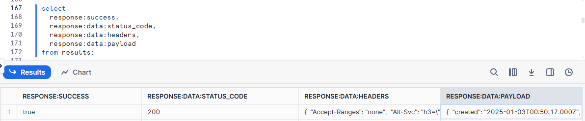 DECLARE response variant; BEGIN -- Upload the file to Google Drive response := (CALL request( type => 'post', endpoint => 'upload/drive/v3/files', parameters => {'uploadType':'media'}, headers => { 'Authorization': 'Bearer {{ secrets.google_oauth_token }}' }, filepath => 'drive/accounts.csv.gz', compress_decompress => true )); -- Update the file metadata (name) RETURN (SELECT request( type => 'patch', endpoint => 'drive/v3/files/' || :response:data:payload:id, headers => { 'Authorization': 'Bearer {{ secrets.google_oauth_token }}' }, body => { 'name': 'accounts.csv' } )):data:payload; END;