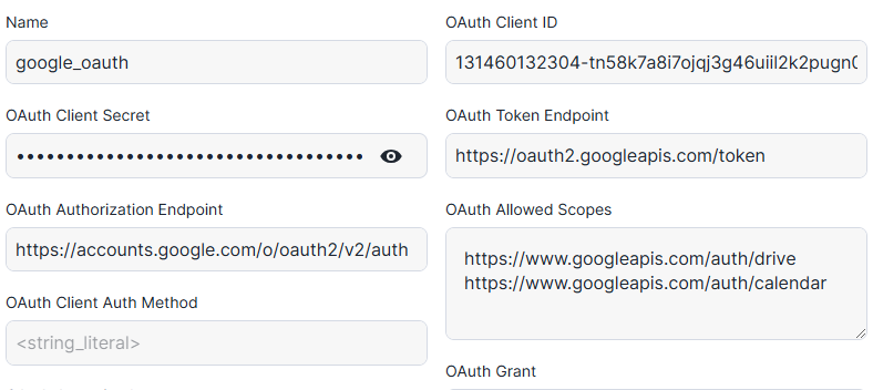 Name: google_oauth OAuth Client ID: <Consumer Key> OAuth Client Secret: <Consumer Secret> OAuth Token Endpoint: https://oauth2.googleapis.com/token OAuth Authorization Endpoint: https://accounts.google.com/o/oauth2/v2/auth OAuth Allowed Scopes: https://www.googleapis.com/auth/drive https://www.googleapis.com/auth/calendar